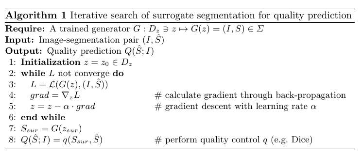 Paper aims to find a latent vector \(z_{sur}\) which, when passed through the generator \(G\) yields a good quality image-segmentation pair \(X\) (\(X=(I,S)\)). For doing that it uses the fact that since VAE has been trained on good quality image-segmentation pairs, the reconstruction loss for such a pair would be low. Paper first gets an initial latent vector \(z_0\) by passing the input (I,S) through VAE’s encoder. Main idea now is to find a latent vector \(z_{sur}\) near to \(z_0\) which has a lower loss. Paper finds such a latent vector using gradient of the reconstruction loss in an iterative fashion. The iteration stops when then loss plateaus around some value. Paper indirectly shows that this latent vector indeed generates good quality image-segmentation pair by demonstrating the effectiveness of the quality control done using this method.